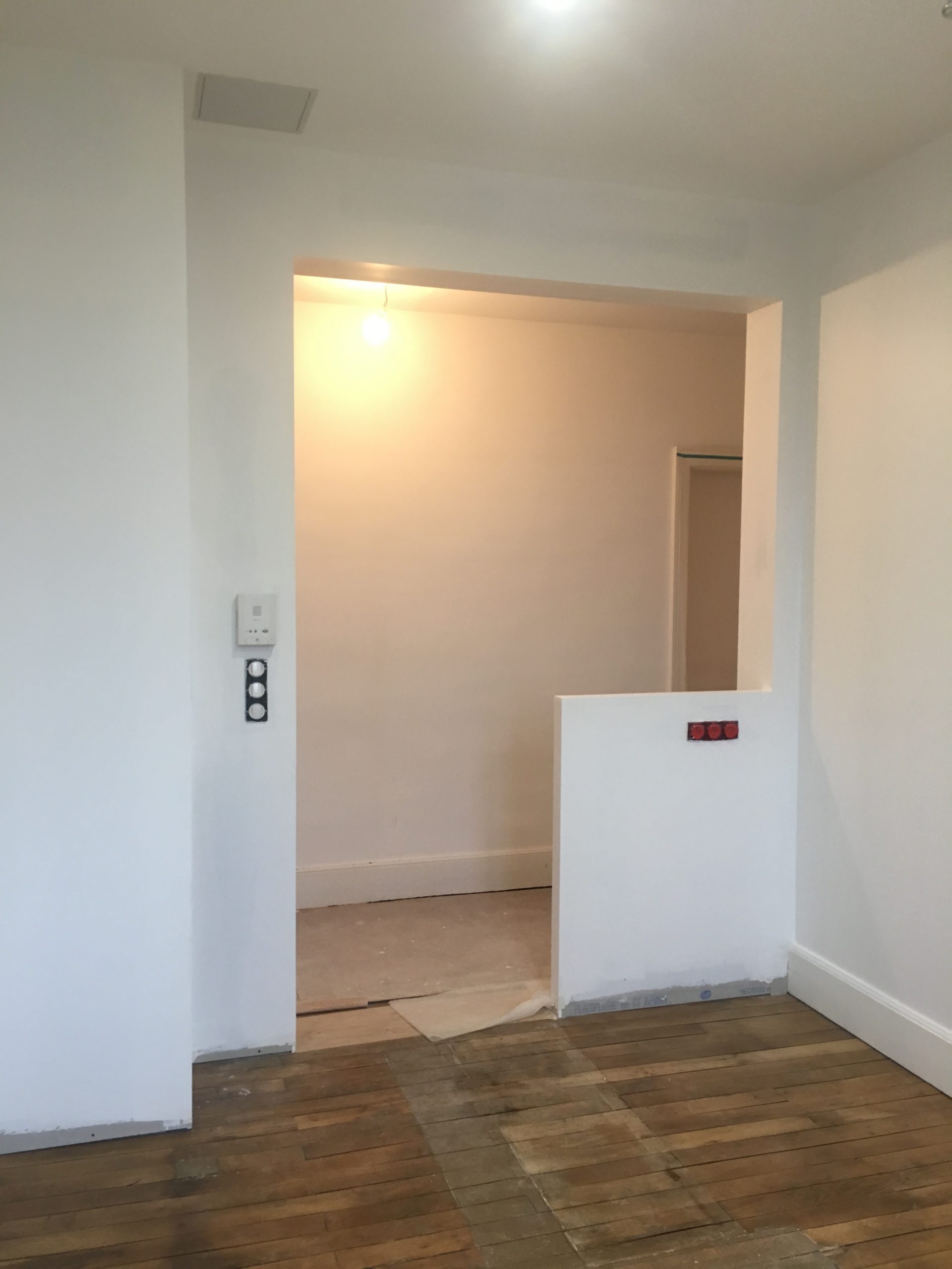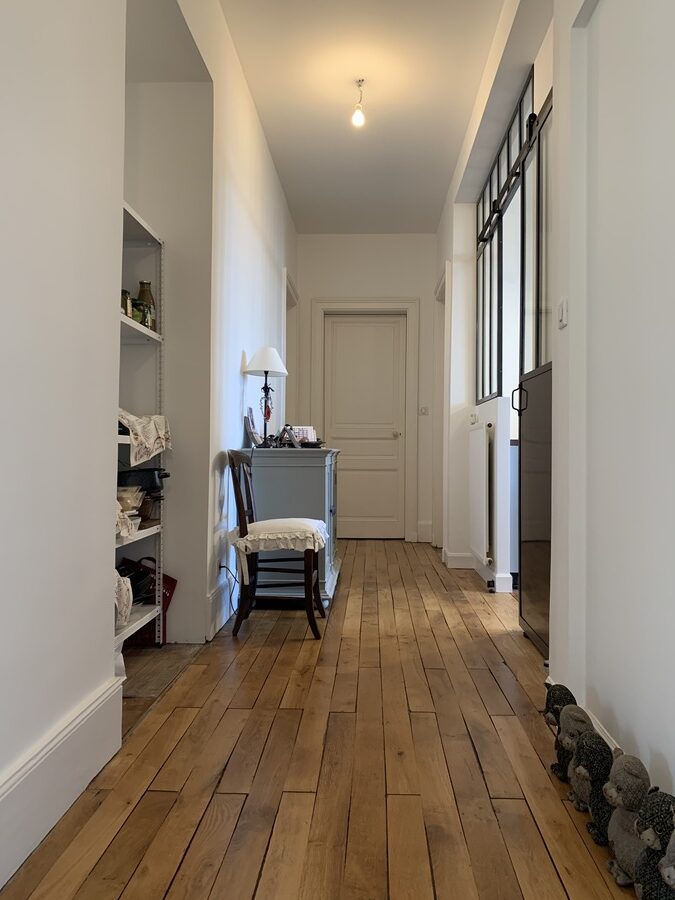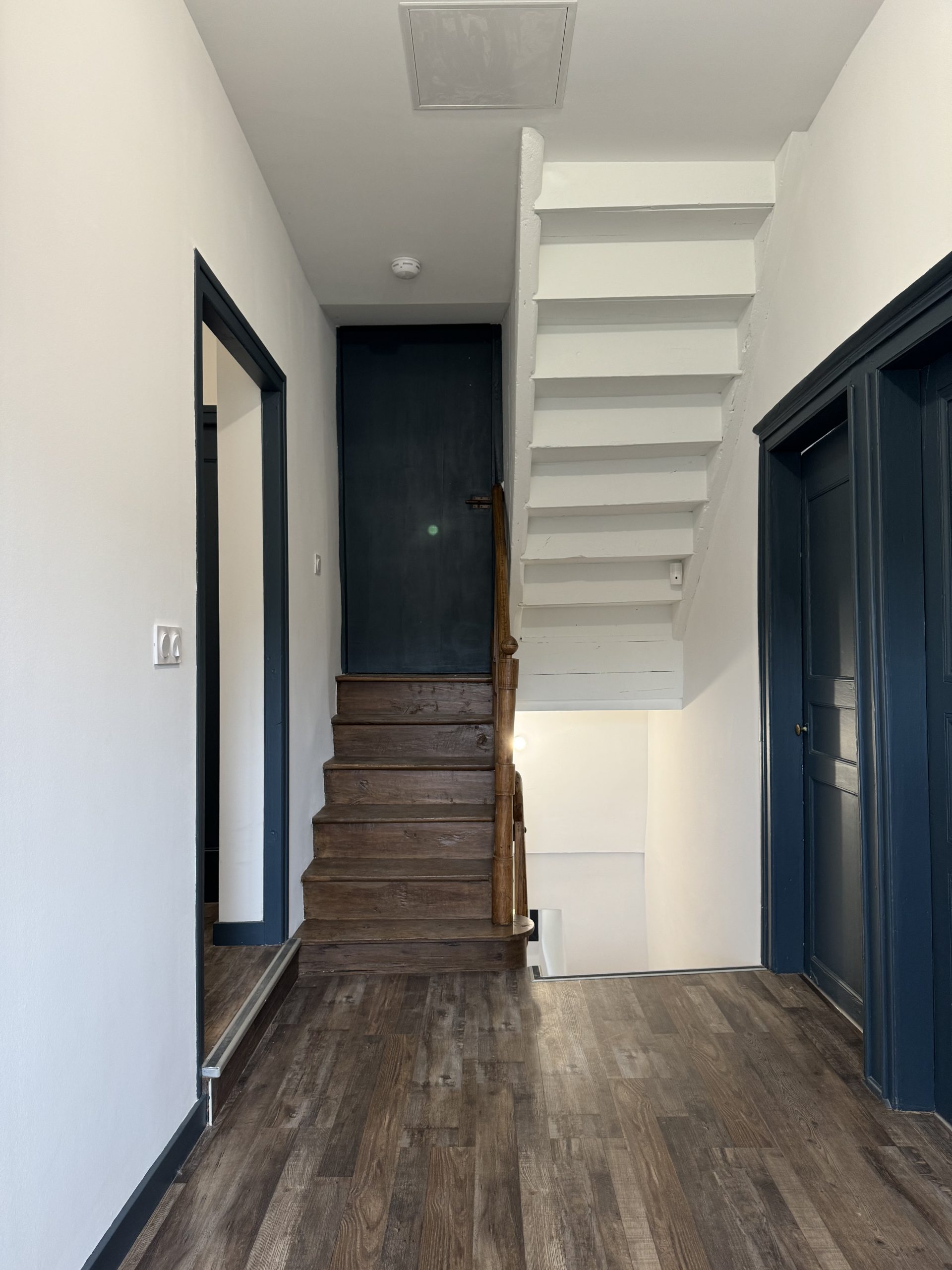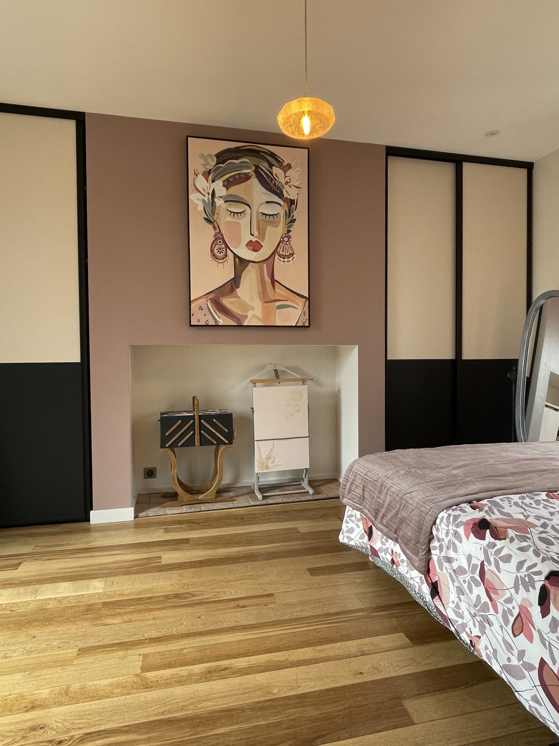 Pour cette ancienne maison des années 1900, nos équipes ont totalement rénové l’étage de cette maison composée d’une salle d’eau, d’un bureau, de deux chambres et d’un WC. L’ancienne moquette a laissé place à un magnifique parquet qui a été poncé et vitrifié. Les couleurs de peinture et les papiers peints @delzongle modernisent l’ensemble.