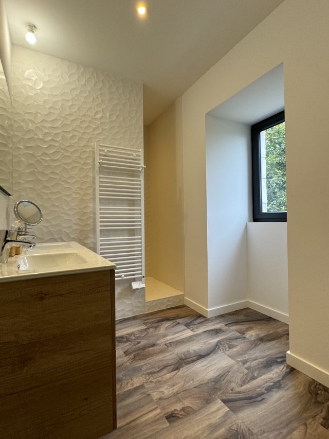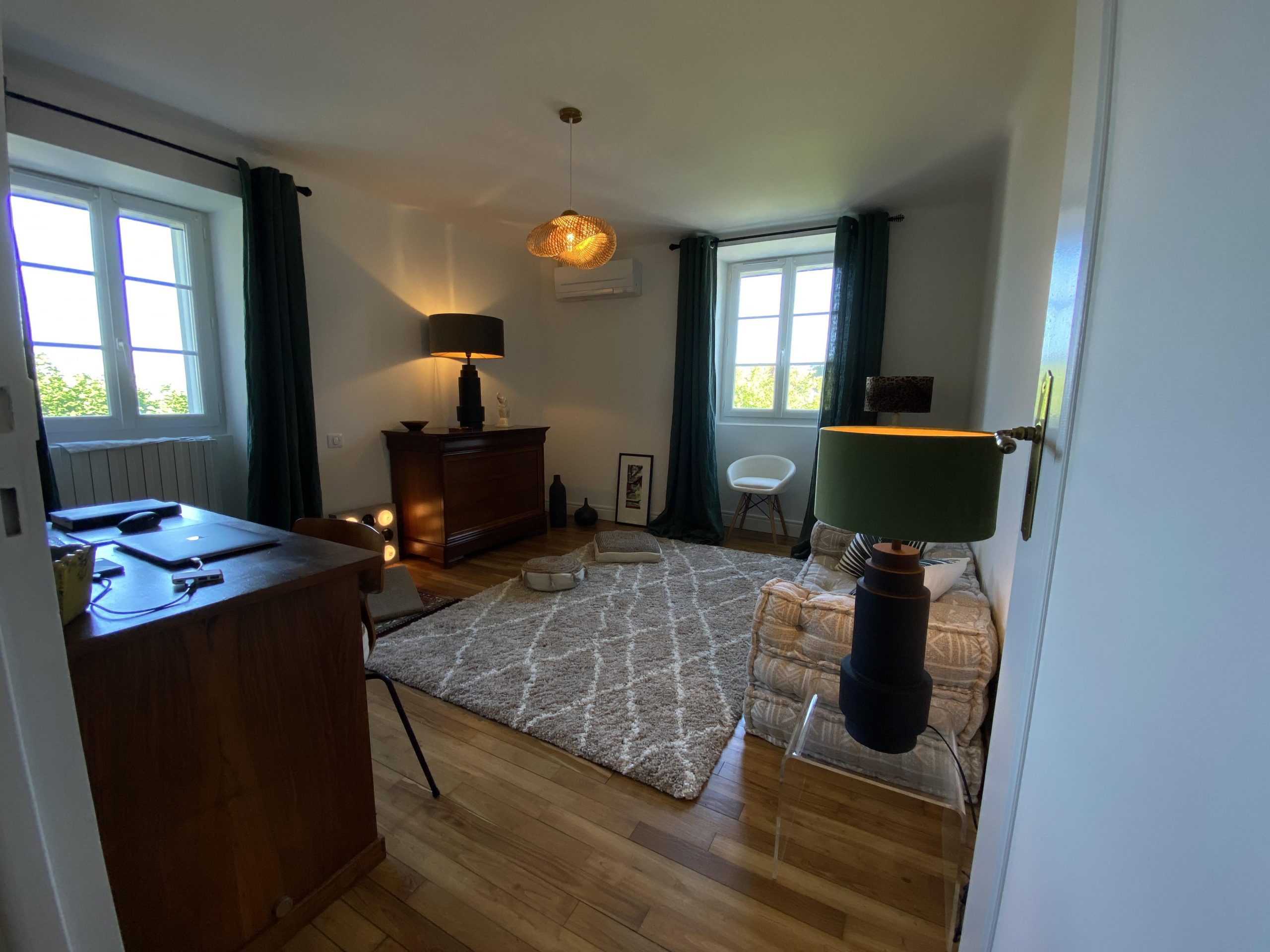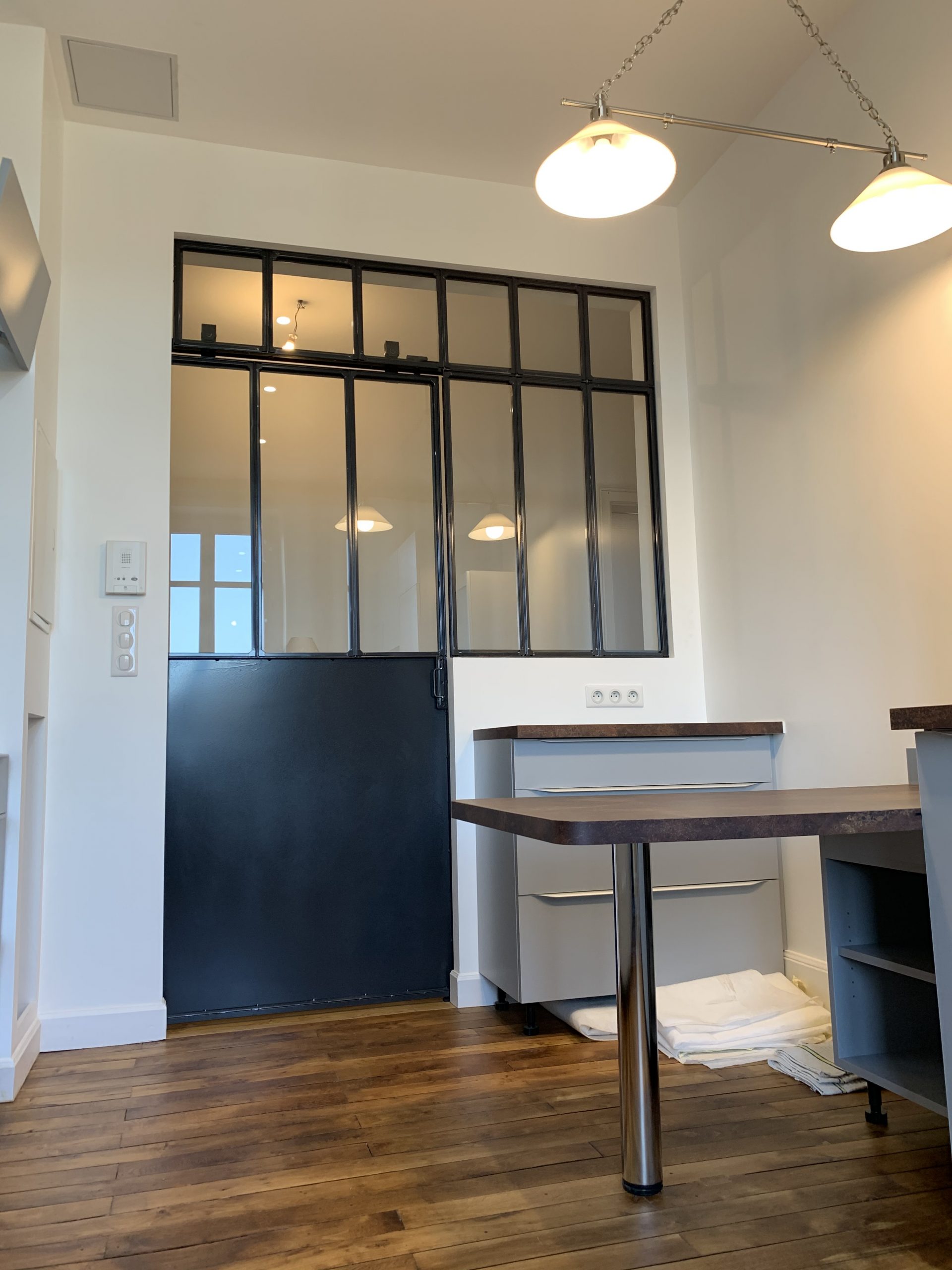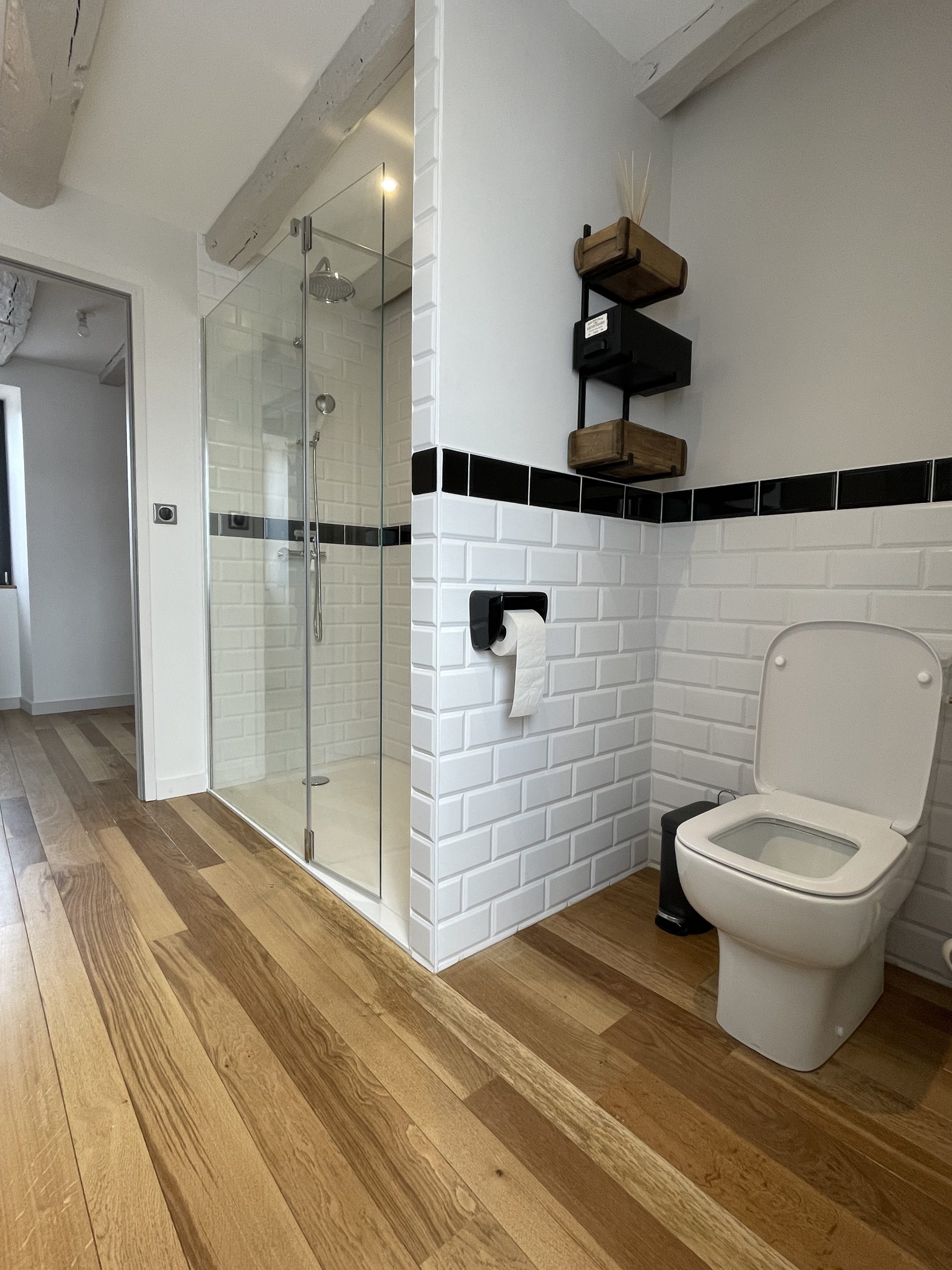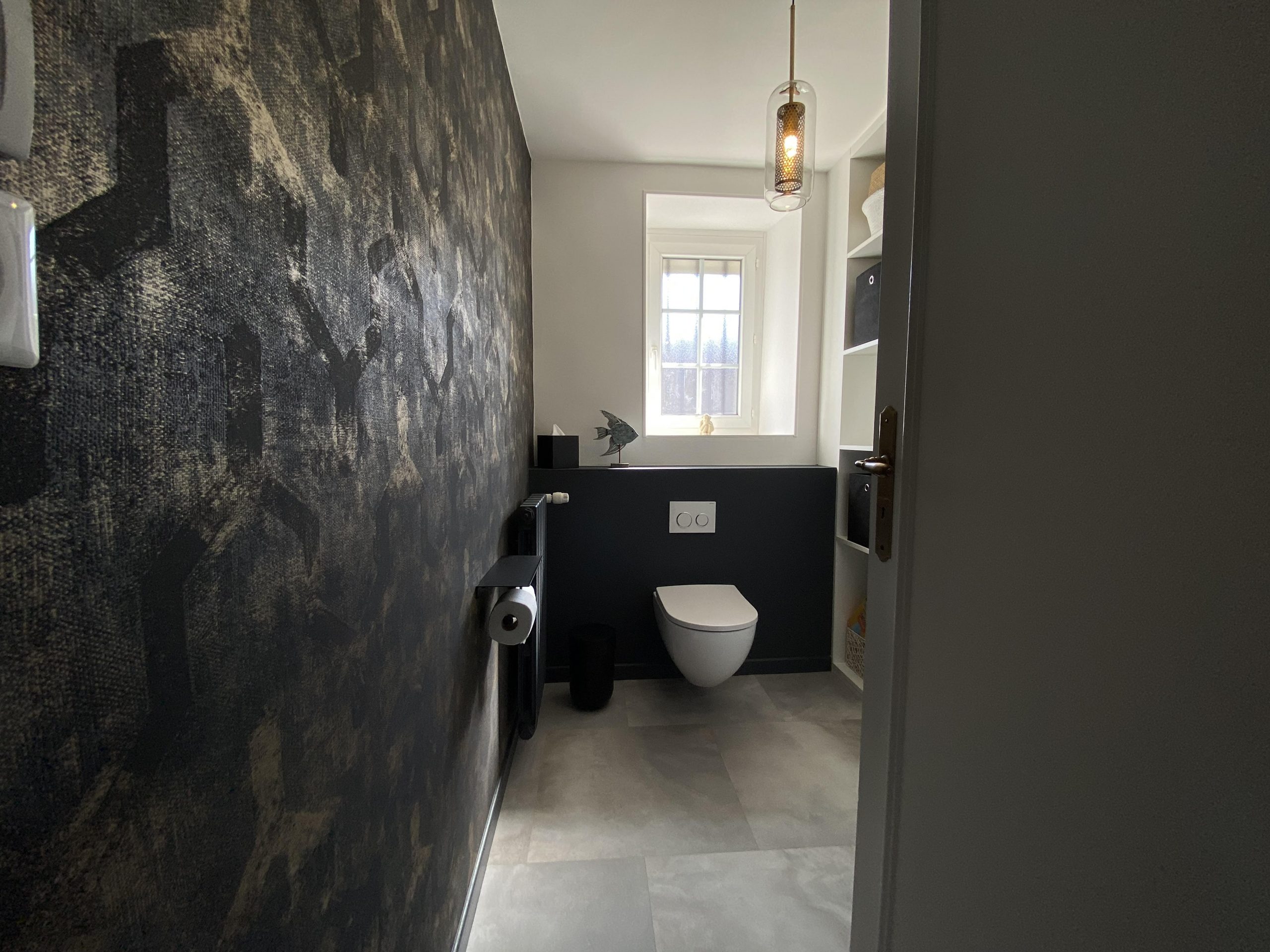 Pour cette ancienne maison des années 1900, nos équipes ont totalement rénové l’étage de cette maison composée d’une salle d’eau, d’un bureau, de deux chambres et d’un WC. L’ancienne moquette a laissé place à un magnifique parquet qui a été poncé et vitrifié. Les couleurs de peinture et les papiers peints @delzongle modernisent l’ensemble.
