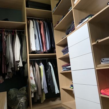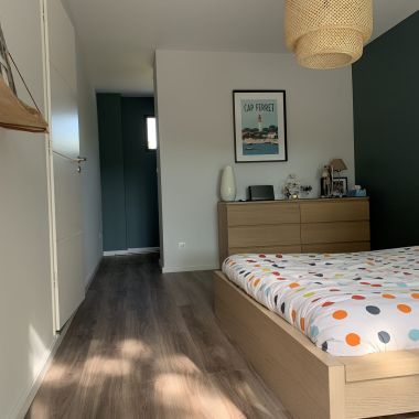 Pour ce projet, nos clients souhaitaient aménager leur ancien garage en chambre parentale avec dressing. Nous avons rénové l’intégralité de ce projet de la conception aux peintures finales en passant par le chauffage et la réalisation du dressing sur mesure. L’accès à cette pièce n’existait pas, nous avons ouvert un mur porteur pour donner accès à l’habitation existante. Nos clients ont profité de leur nouvel espace 2 mois après le début du chantier.