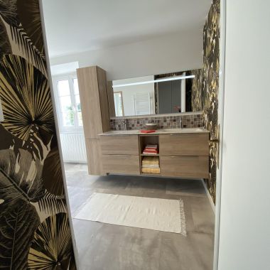Pour cette ancienne maison des années 1900, nos équipes ont totalement rénové l’étage de cette maison composée d’une salle d’eau, d’un bureau, de deux chambres et d’un WC. L’ancienne moquette a laissé place à un magnifique parquet qui a été poncé et vitrifié. Les couleurs de peinture et les papiers peints @delzongle modernisent l’ensemble.