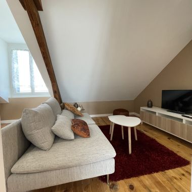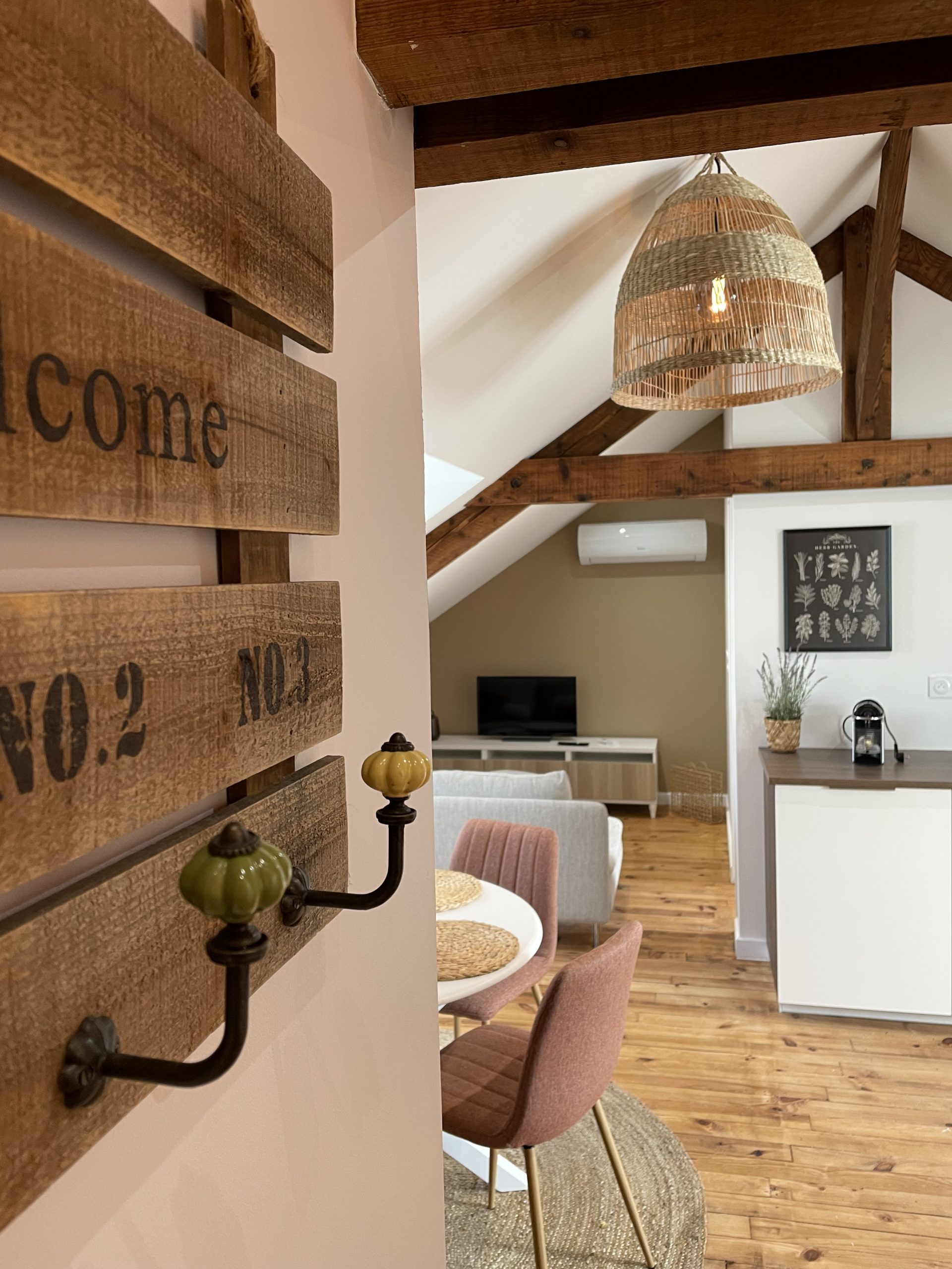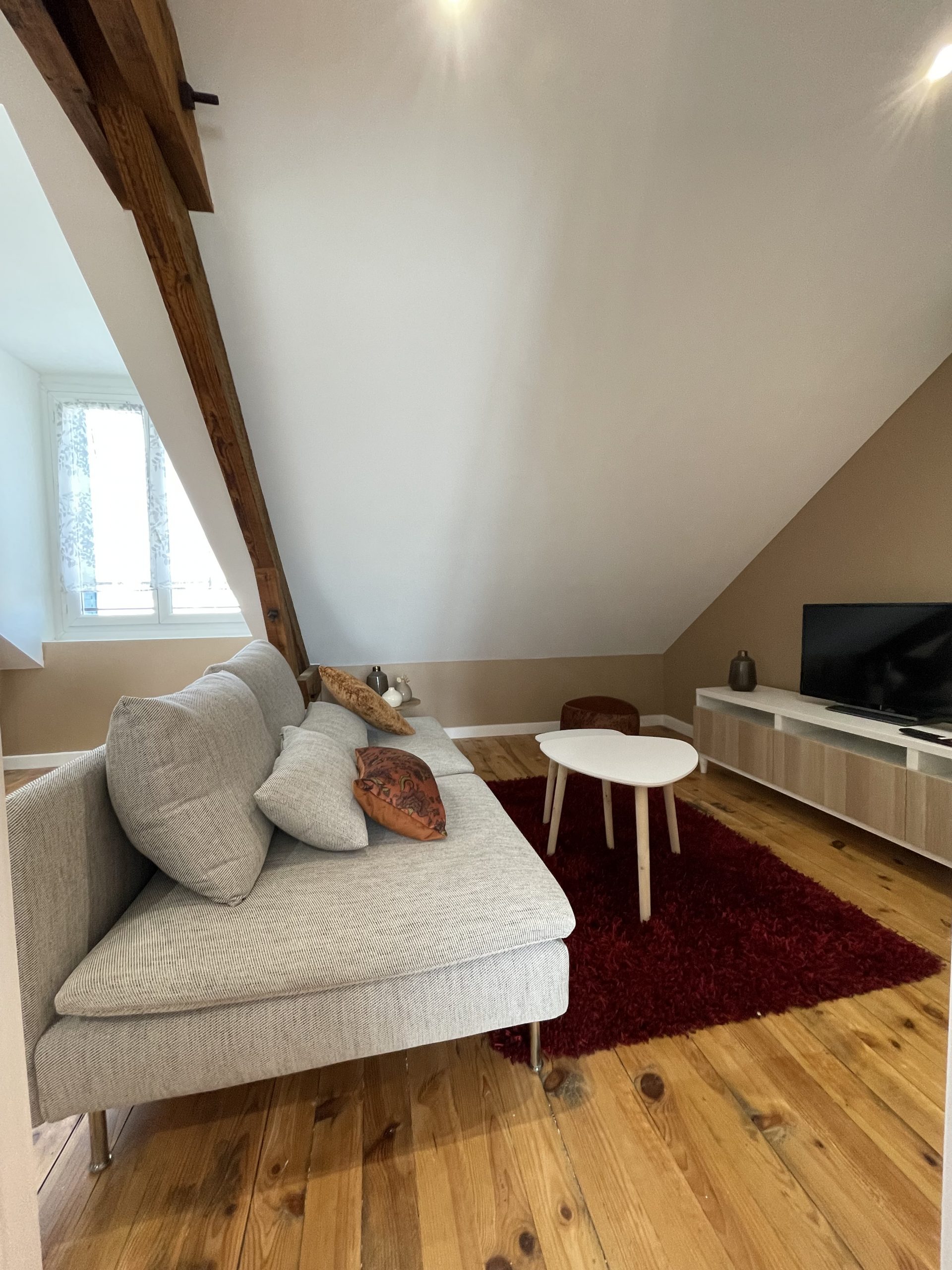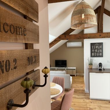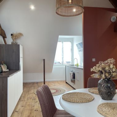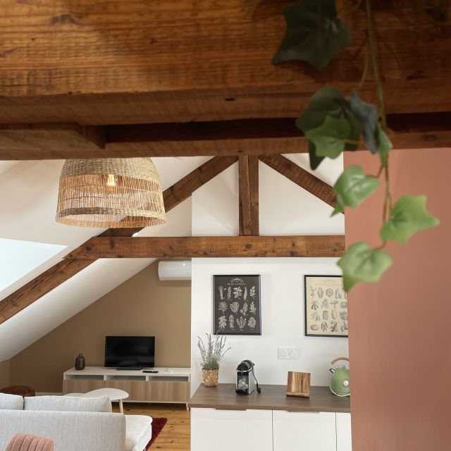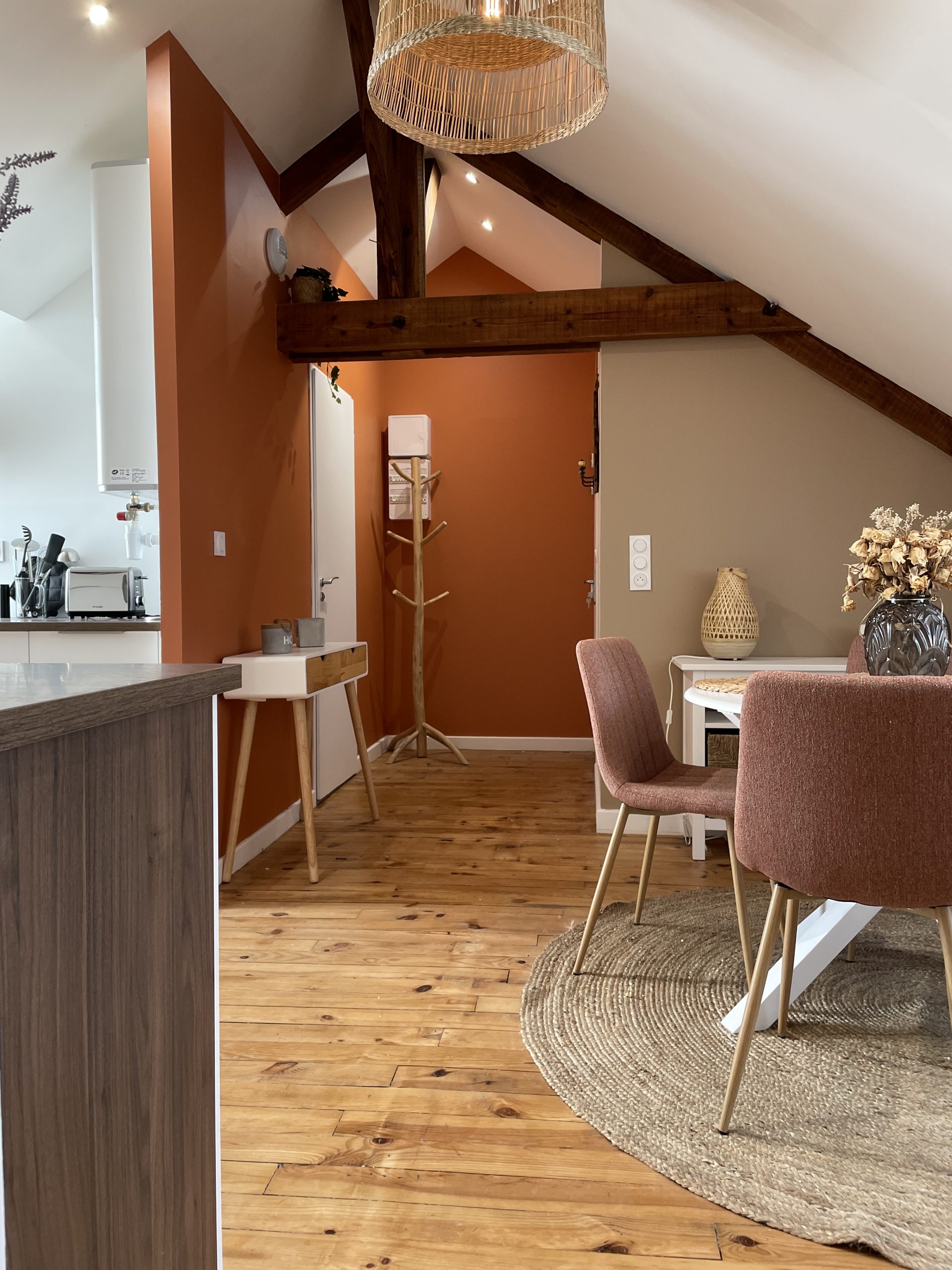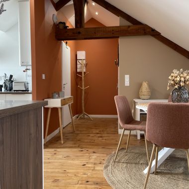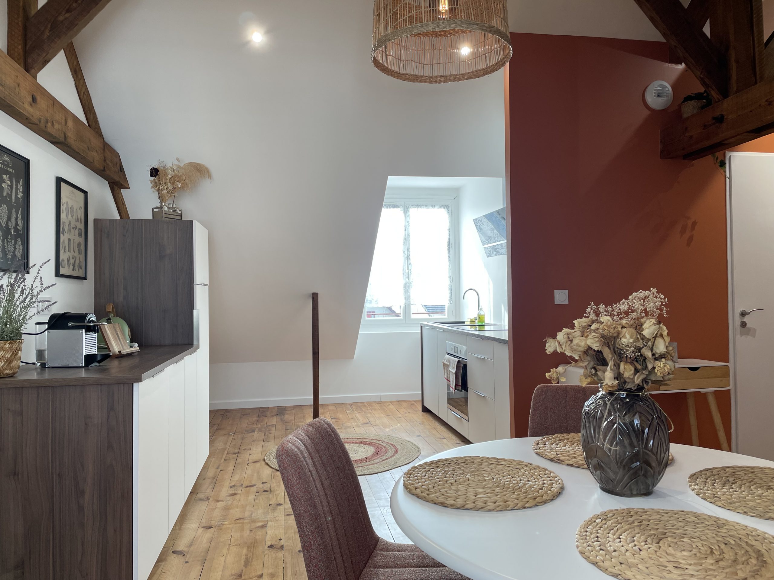 Nous avons réfléchi à la meilleure façon de mettre en valeur l’atout principal de cet appartement : les jolies fermes en bois. Place aux couleurs chaudes et aux lignes courbes pour un intérieur harmonieux et chaleureux.