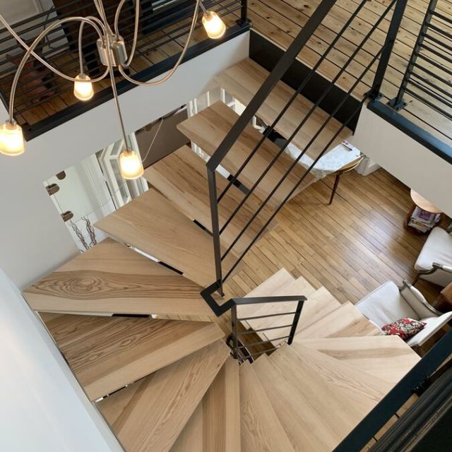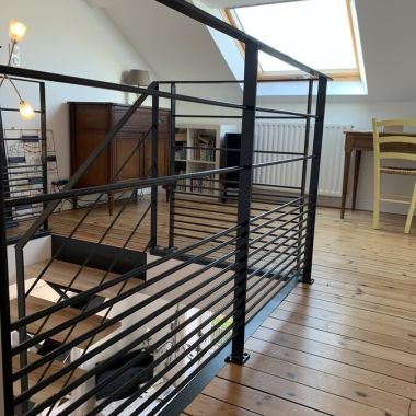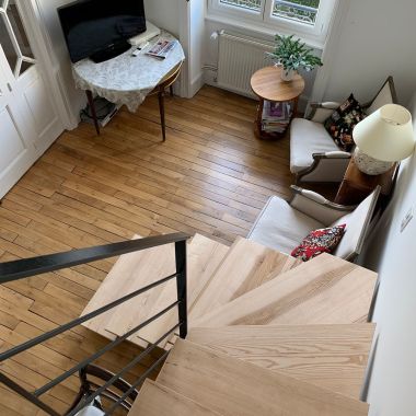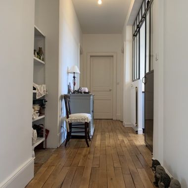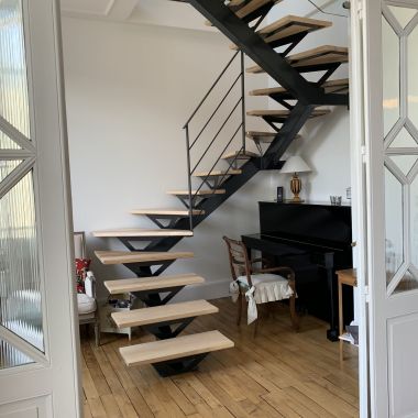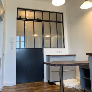 Pour ce projet, nos clients souhaitaient déplacer leur cuisine et l’escalier pour l’accès à l’étage. Nous avons opté pour un esprit industriel avec cet escalier métal et bois qui s’intègre parfaitement avec le magnifique parquet massif de cet appartement en duplex. La cuisine, quant à elle, trouve sa place dans l’ancienne buanderie et un rappel et effectué avec la verrière et la porte coulissante acier.